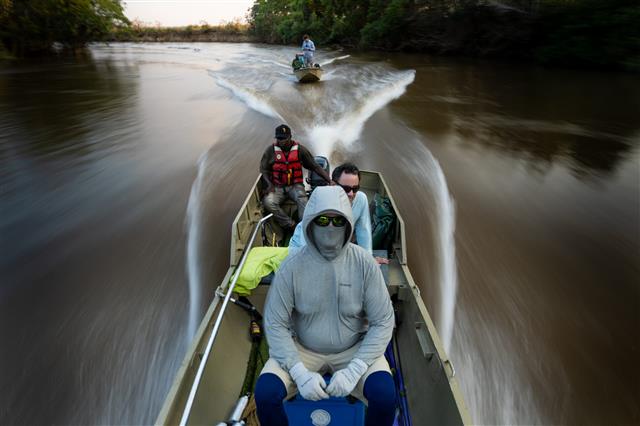 Основной формат рыбалки проходит в дрейфе по живописным и труднодоступным участкам рек. Опытные гиды управляют надёжными 18-футовыми лодками Go Devil, оснащёнными моторами мощностью 25 л.с., позволяющими уверенно перемещаться вдоль затопленных деревьев, крутых береговых обрывов, песчаных кос и каменистых перекатов — мест, где чаще всего скрываются трофейные хищники.