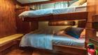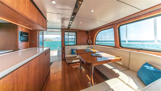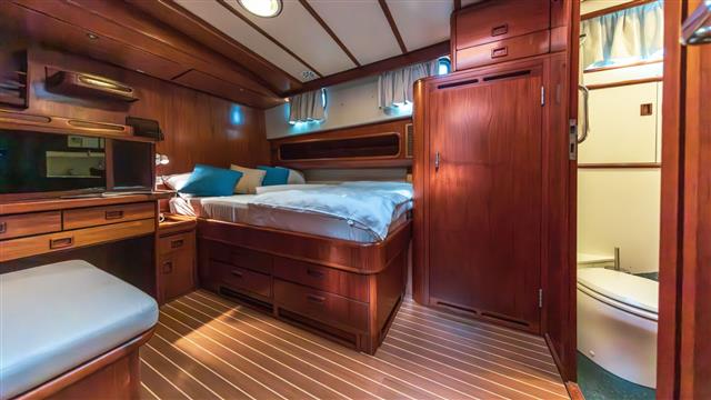 На судне расположены 3 гостевые каюты. Одна каюта с двуспальной кроватью и собственной ванной комнатой. Две каюты с двухъярусными кроватями и двумя ванными комнатами. Все каюты, а также гостиная, камбуз и рулевая рубка полностью кондиционированы. В гостиной есть просторная зона отдыха, которая также используется как обеденная зона.